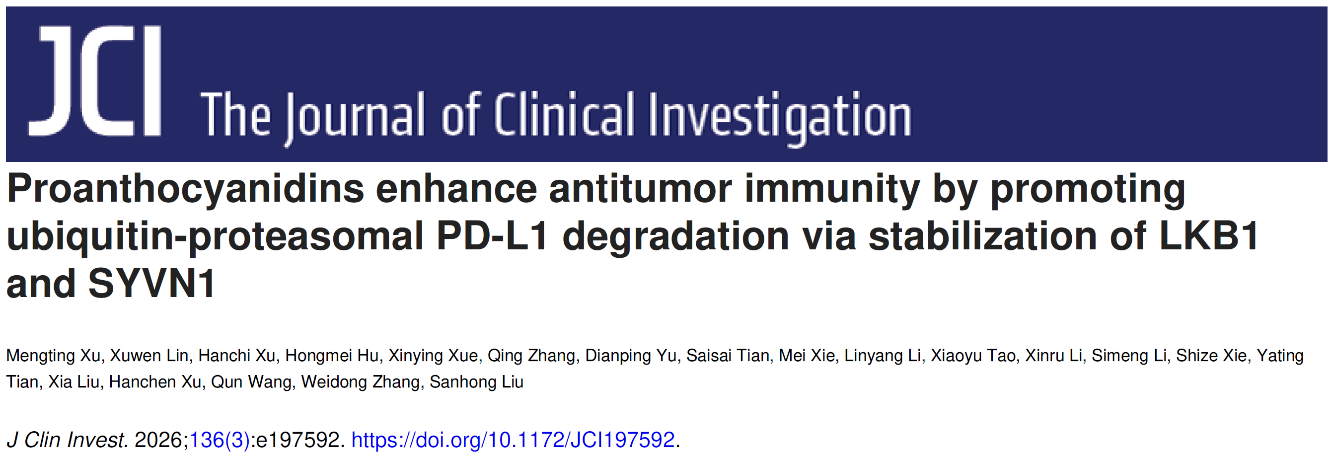 近日,万象城官网交叉科学研究院刘三宏团队联合海军军医大学张卫东、刘霞团队及龙华医院徐汉辰团队,在国际权威学术期刊《Journal of Clinical Investigation》发表重要研究成果。论文以“Proanthocyanidins enhance antitumor immunity by promoting ubiquitin-proteasomal PD-L1 degradation via stabilization of LKB1 and SYVN1”为题,首次系统阐明了葡萄籽等植物中富含的低聚黄酮类化合物原花青素作为新型免疫检查点调节剂的分子机制与治疗潜力,为肿瘤免疫治疗开辟了全新路径。