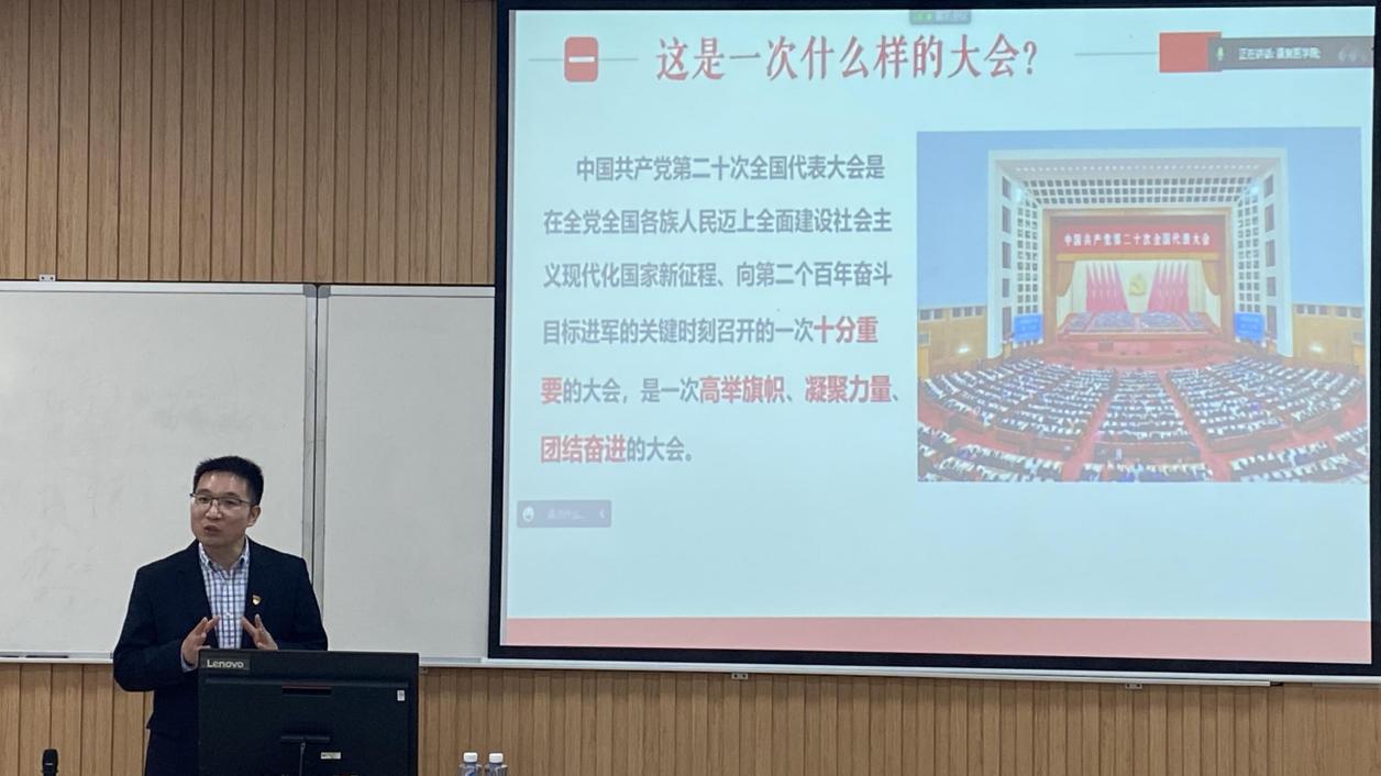 马克思主义学院党总支书记陶思亮教授作“中国式现代化与坚持中国共产党领导”专题讲座。他从大会的重要意义、代表的产生、报告的起草和大会主要成果等方面介绍中国共产党第二十次全国代表大会的概况。随后带领全院师生深入学习领会党的二十大精神,过去5年的工作和新时代10年的伟大变革,开辟马克思主义中国化时代化新境界,新时代新征程中国共产党的使命任务,中国式现代化的中国特色和本质要求等方面的内容。他希望学生们坚定不移听党话、跟党走,怀抱梦想又脚踏实地,敢想敢为又善作善成,立志做有理想、敢担当、能吃苦、肯奋斗的新时代好青年。