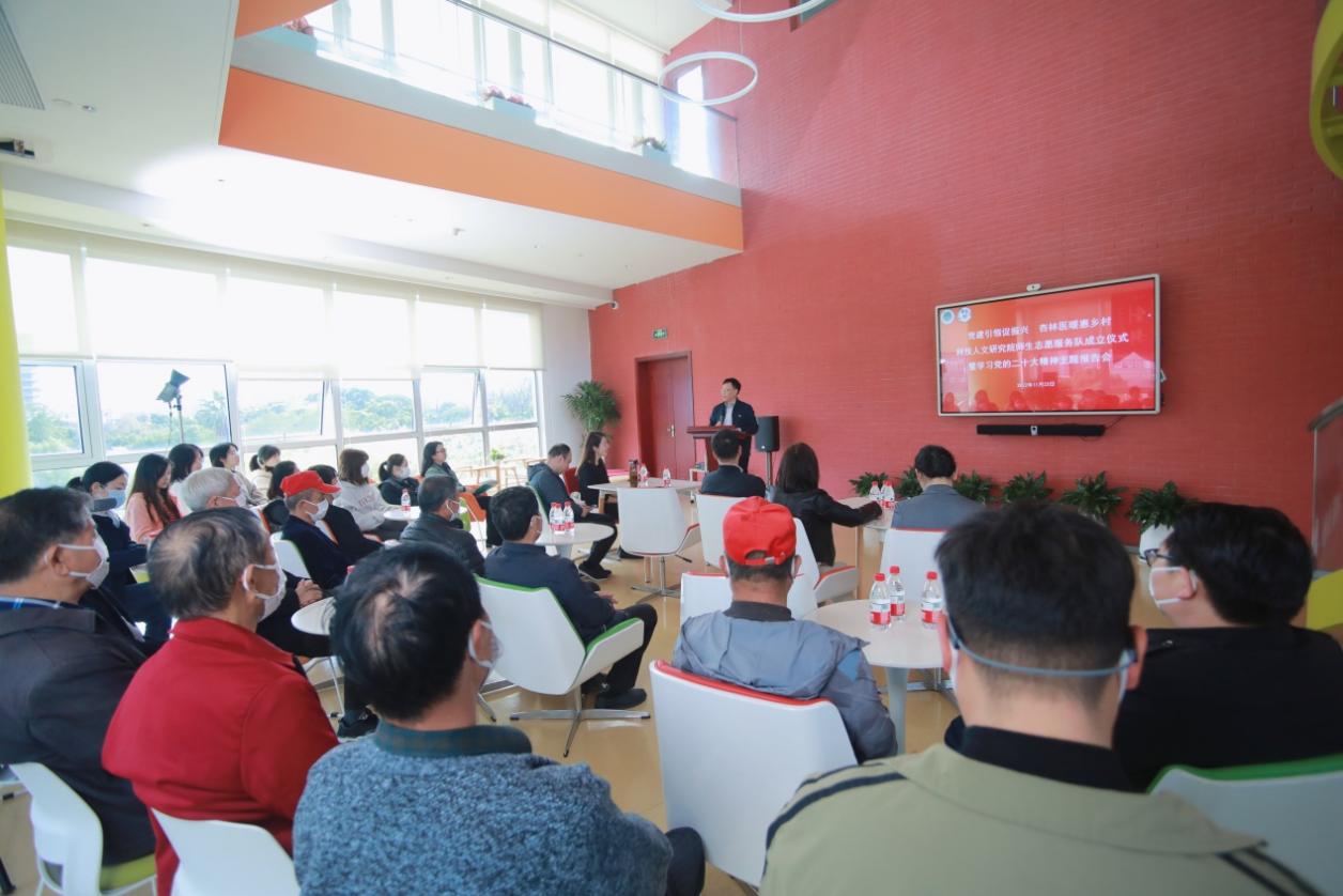 为学习贯彻党的二十大精神,进一步打造党建特色,发挥中医药优势,服务乡村振兴,11月23日下午,“党建引领促振兴 杏林医暖惠乡村”科技人文研究院师生志愿服务队成立仪式暨学习党的二十大精神主题报告会在国际交流合作中心多功能厅举行。科技人文研究院党总支书记吴志新,副院长、副书记张亭立,校团委书记万婕,张江镇新丰村居民区党总支第一书记季群、党总支书记周建云,上海市委党校谷宇教授,科技人文研究院第一党支部书记徐丽莉、第五党支部书记王欢等师生代表出席。科技人文研究院第二党支部书记任宏丽主持会议。