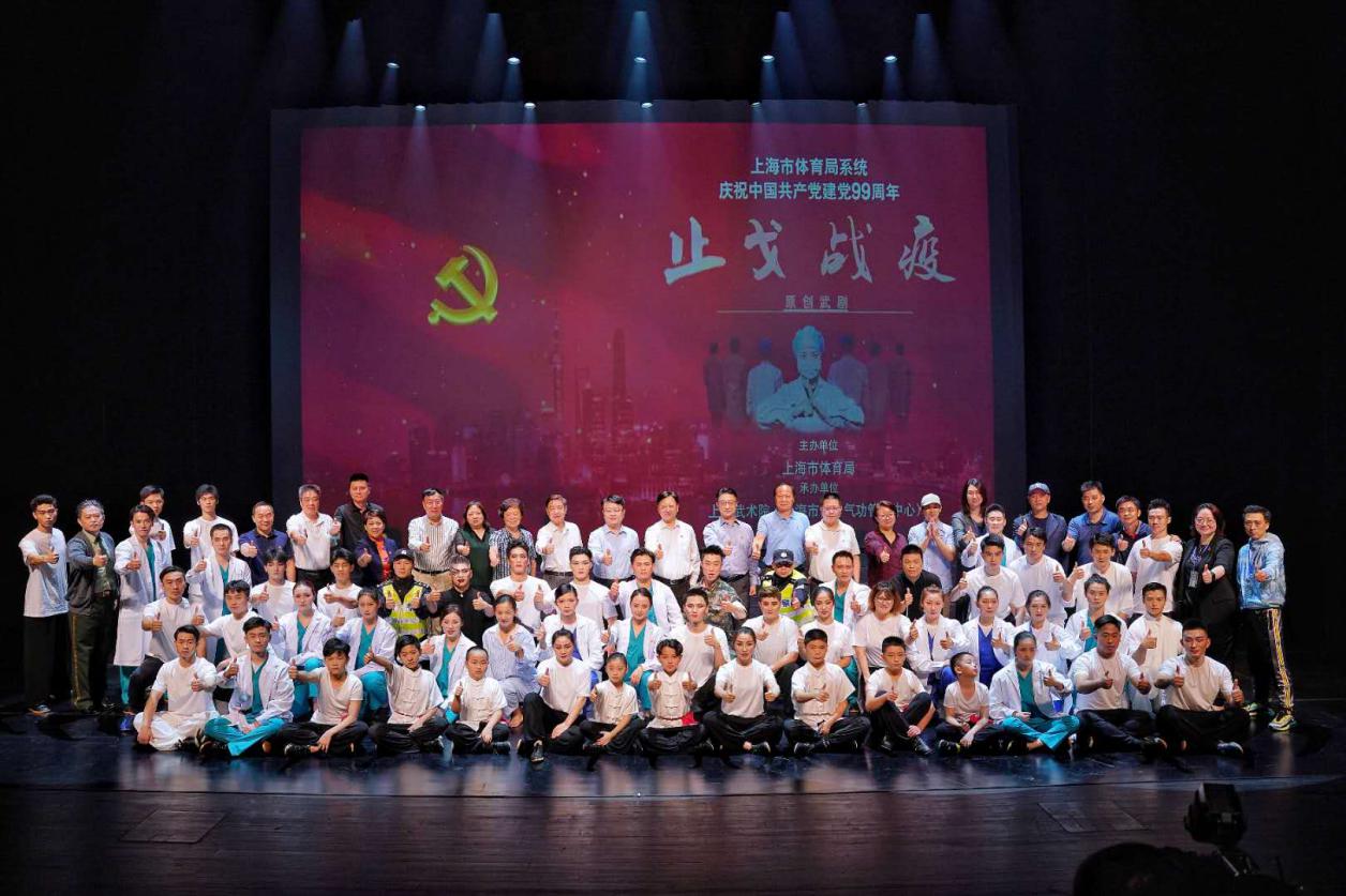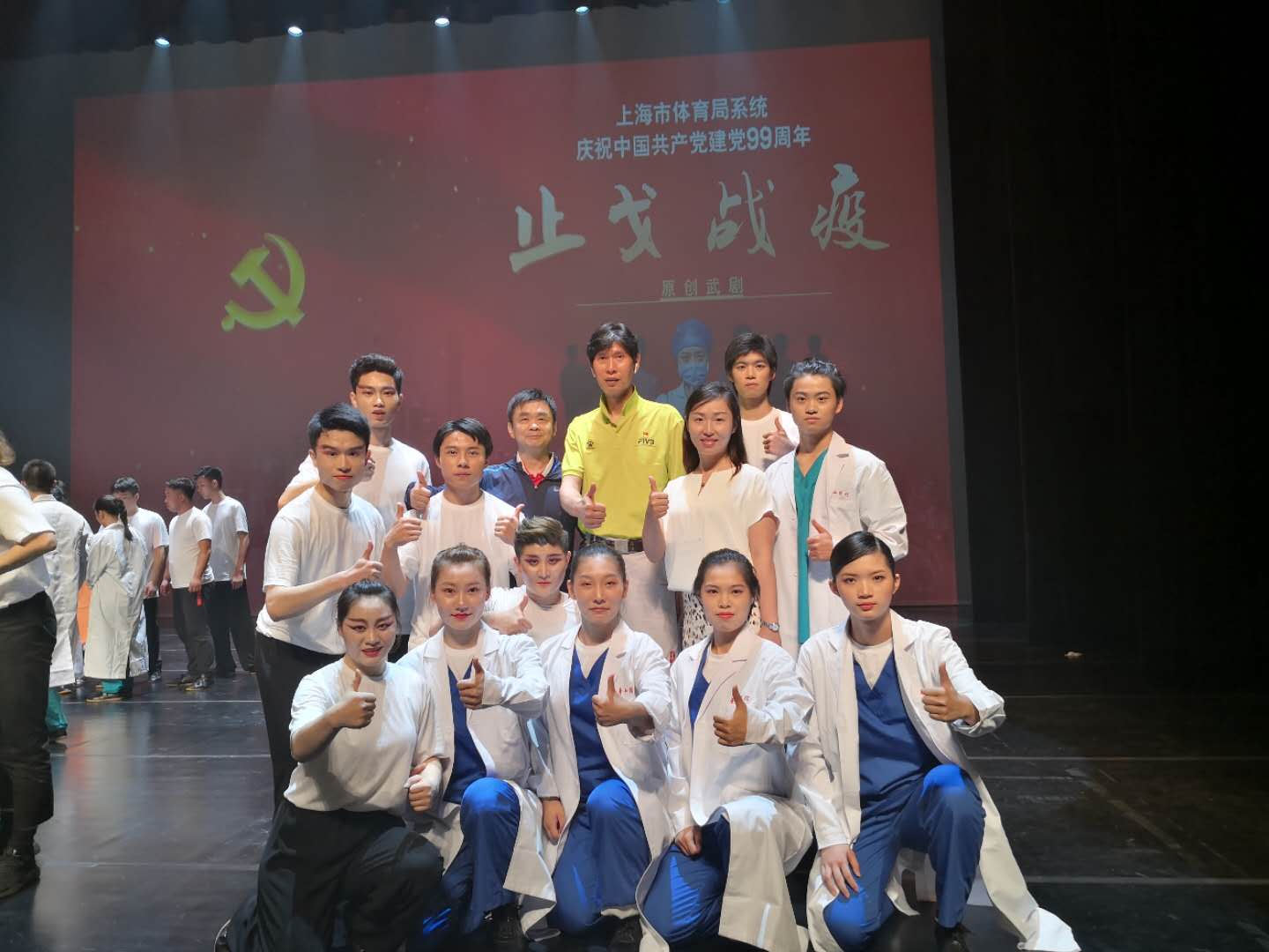 7月6日,为庆祝中国共产党成立99周年,向战斗在抗疫一线的“逆行者”们致敬,由上海市体育局牵头组织全国首个以抗疫为主题的原创武术舞台剧在上海国际舞蹈中心精彩上演。万象城官网体育部党支部应上海市体育局直属机关党委的邀请,参与“一支部一特色”共建活动。活动期间,《止戈战疫》节目聘请校体育部党支部宣传委员、武术队总教练陆松廷担任总导演,邀请校武术队队员共同参演。