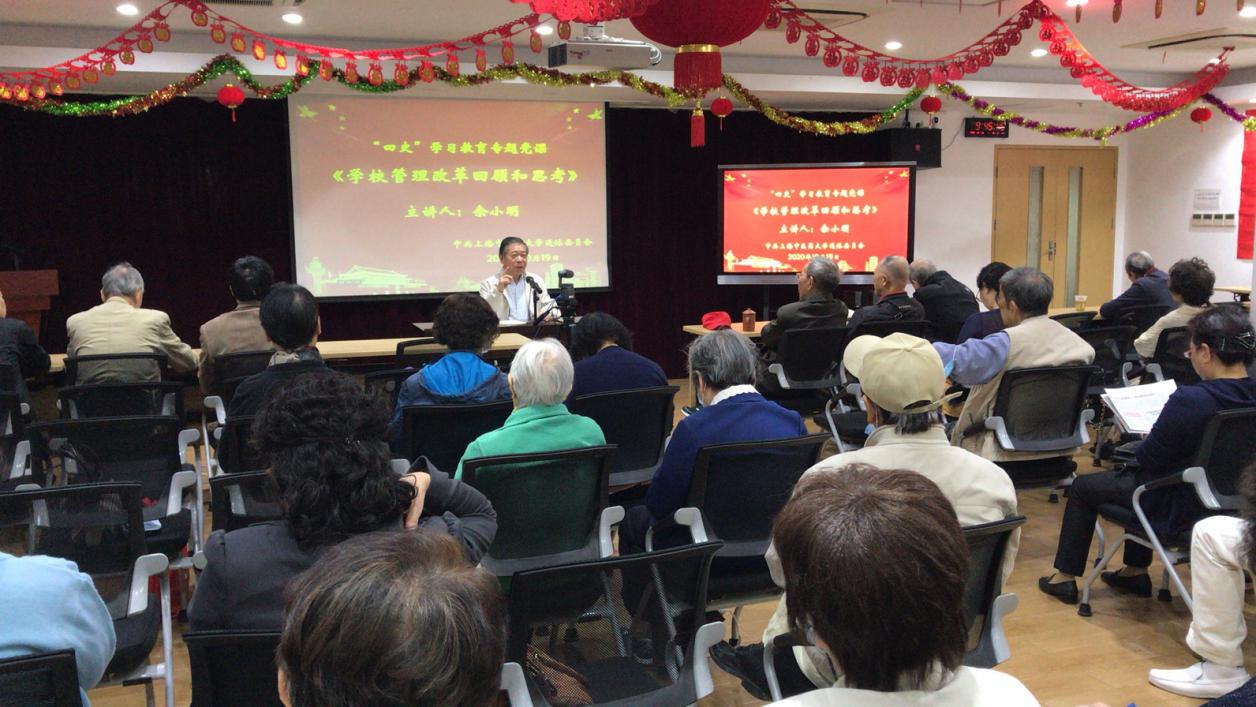 10月19日上午,万象城官网退休党委在零陵路校区203会议室开展“四史”学习教育专题党课活动。万象城官网原副校长余小明作题为《学校管理改革回顾和思考》的党课,80余位退休党员参加。会议由退休党委书记顾家柱主持。