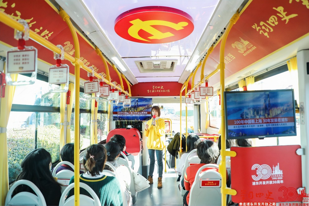不同于传统固定的“四史”学习教育阵地,红色巴士课堂是一个移动的“四史”学习教育平台,通过边行车、边参观、边讲课、边互动的学习形式,让“四史”学习教育的过程更具代入感。讲解员从“历史选择了浦东”“从一只羊到30多万金融从业人员”“从超级CBD到世界会客厅”“从上交所鸣锣到科创板落地”等九个板块,涉及20余个地标建筑、30多个浦东故事、超100页图文解说、7000字文稿,以扎实的内容、新颖的形式、生动的讲解构造沉浸式的学习体验,实现了车内讲解与车外景观的完美融合,在陆家嘴的天然“四史”课堂中为广大党员上一堂身临其境的“四史”学习教育课。