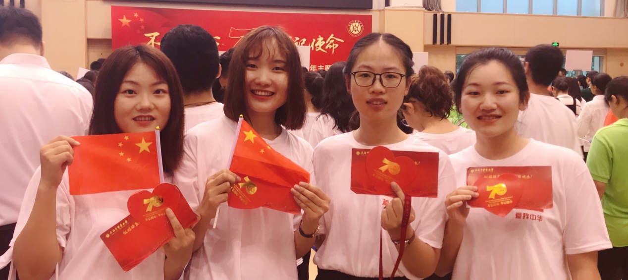 穿着印有国旗和“爱我中华”字样的T恤,戴上团徽和“建国七十周年”纪念徽章,站在灯火通明的体育馆内,内心的激动与期待早已无法掩盖,化为了一张张诚挚的笑脸。