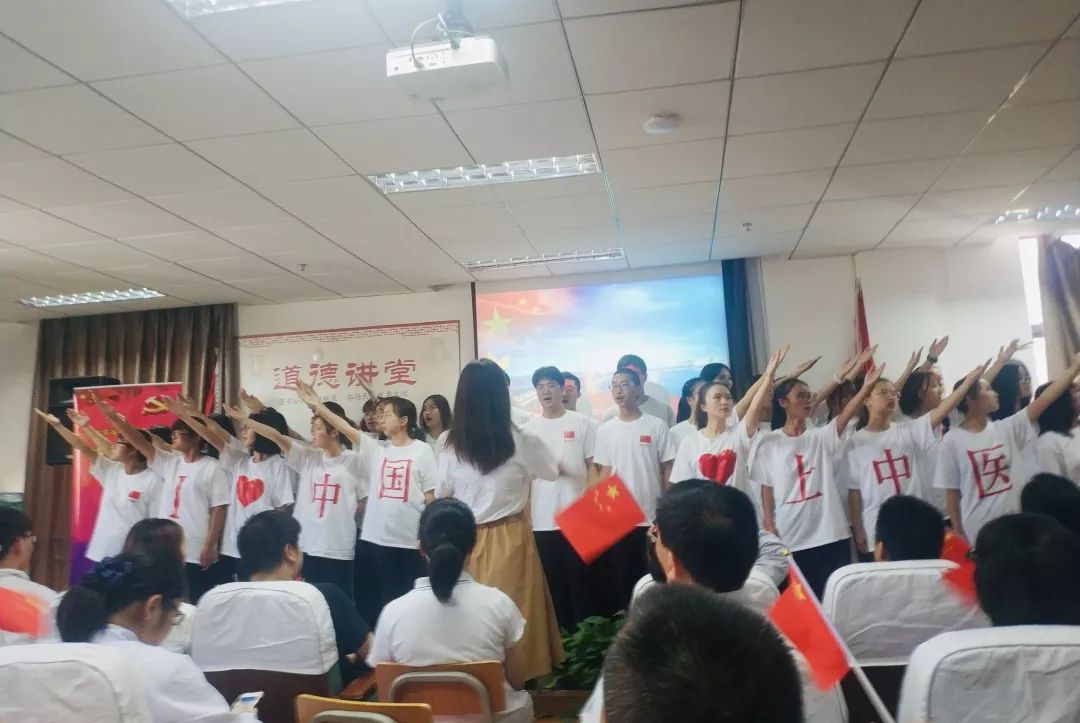 当国旗护卫队踏着整齐划一的步伐,来到舞台中央,熟悉的《义勇军进行曲》响起的一刹那,深藏于心的崇敬之情随之迸发,唱了无数遍的国歌在今天这个意义非凡的日子里显得格外庄重有力。挥舞着手中鲜艳的旗帜,我更加坚定了作为一名医学生,未来将为祖国中医药事业奋斗一生、奉献一生的决心!