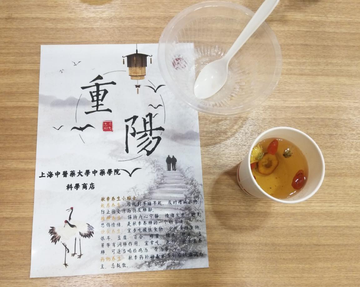 活动前,学生党员与学院科学商店的学生早早抵达居委会,在居委会工作人员的带领下前往附近敬老院,布置现场、准备材料。学生们精心准备“滋补佳品”——菊花枸杞山楂茶。该茶具有清肝明目、预防感冒的功效。居民接过茶杯,品尝后赞不绝口。