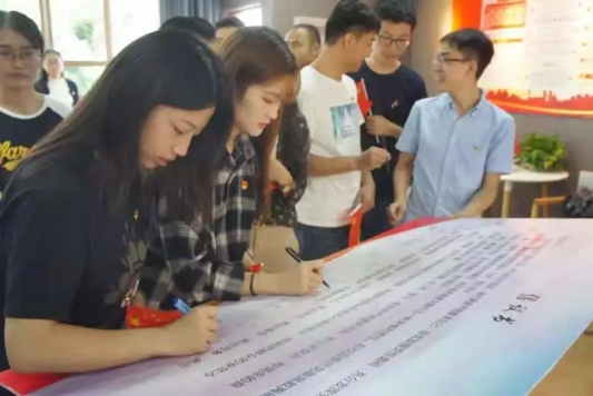 在新中国成立70周年之际,中药学院研究生党总支与护理学院教师党支部携手共聚学生事务中心党建工作室,进行了庄严宣誓仪式。在场师生面对党旗,庄严肃立,紧握右拳重温入党誓词,热血而坚定。国庆日当天,党员同志齐聚体育馆,参加升旗仪式,观看建国70周年阅兵仪式。