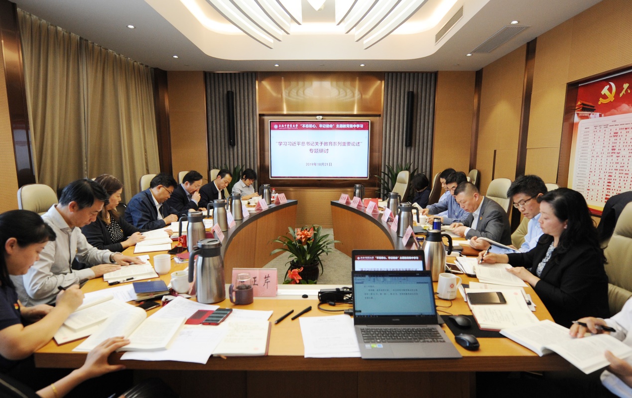 10月21日下午,学校领导班子在行政楼418会议室举行“不忘初心、牢记使命”主题教育集中学习,专题研讨习近平总书记关于教育系列重要论述。校党委书记曹锡康主持学习会。校党委副书记、副校长朱惠蓉,校党委常委、副校长胡鸿毅分别导读教育部课题组编写的《深入学习习近平关于教育的重要论述》节选内容,并作重点发言。