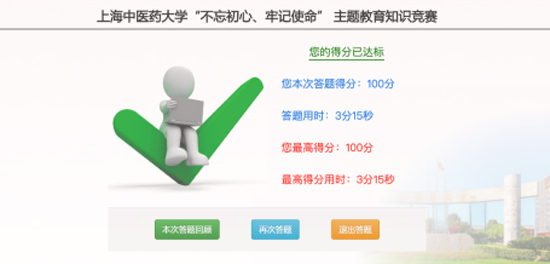 线上竞赛全覆盖。10月上旬,学校党委在抓好集中学习和党员自学的基础上,以线上答题的形式检验广大党员理论学习成果。学习动真格,对党员领导干部提出更高标准,中层以上领导干部必须达到100分。普通党员要求达到90分以上为合格,目前学校党委系统党员参与率达100%,党员领导干部和普通党员合格率均达100%,展示了以赛促学的良好成效。