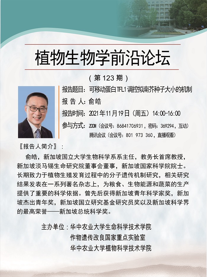 报告时间 2021-11-19 14:00:00 报告题目 可移动蛋白TFL1调控拟南芥种子大小的机制