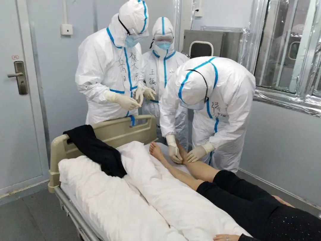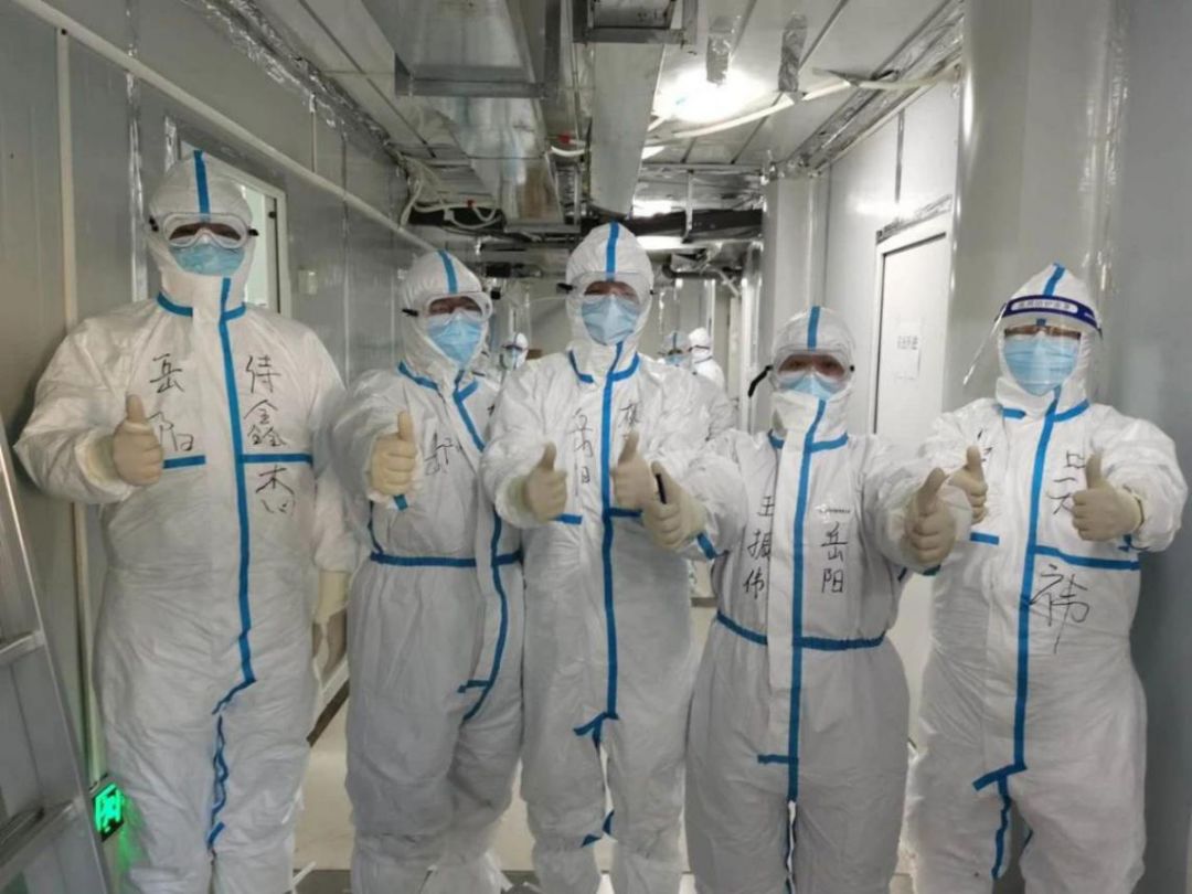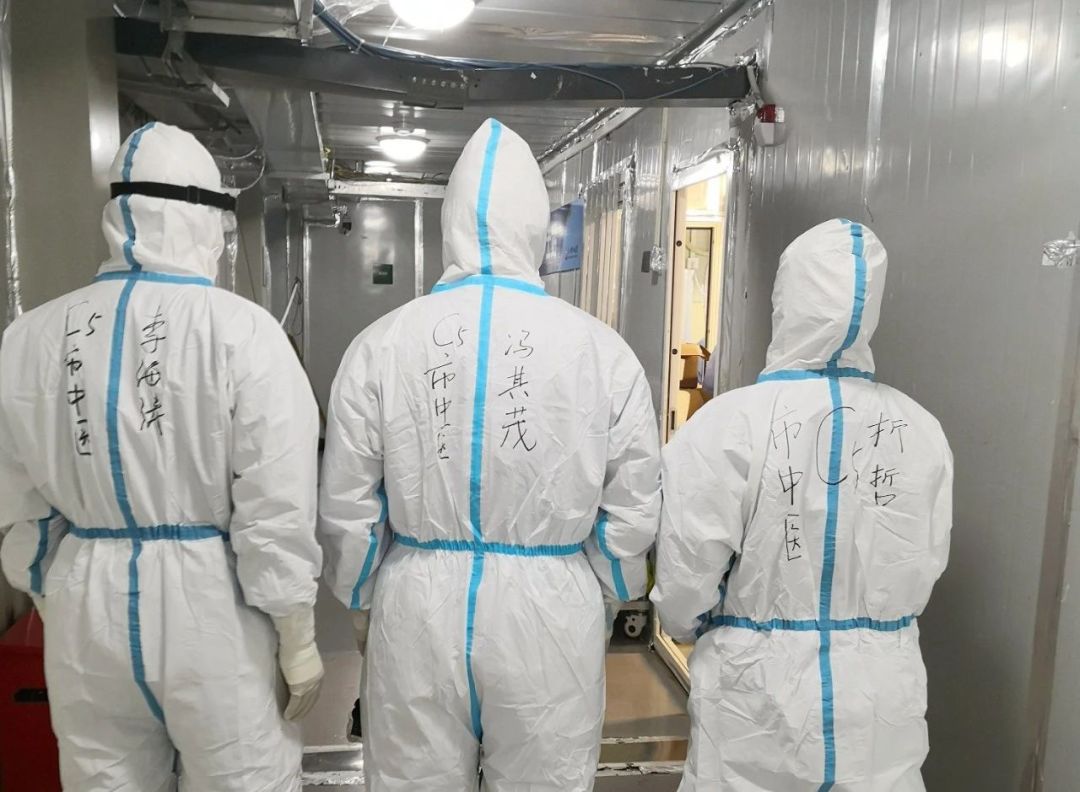 因为任务重,冯其茂、李海涛、折哲三位医生都穿上防护服一起进病房。由于内外温差的缘故,护目镜和眼镜上都蒙上了雾气,视线受到很大影响,冯其茂和李海涛两位医生只能搭着不戴眼镜的折哲医生的肩,让折哲来领路。三人分别负责问病史、看CT片做记录、开关房门记录影像资料,同时鼓励患者要有信心。查房时,医生和患者都戴着很厚的口罩,很多患者交流时只用武汉当地方言,队员们大声反复询问,最后嗓子干得就像在冒着火。出病房污染区时洗手脱衣也是个很费时间的事,消毒一点也不能马虎,不然就会给战友们的健康安全带来极大风险,李海涛说道,“医疗工作离不开团队的相互配合,感谢战友们!”