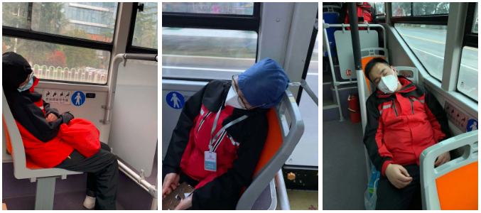 在武汉,每天专用公交车载着医疗队队员们穿梭在武汉的大街小巷,连接起了医院和驻地。归途中,队员们会眨眨酸涩的眼睛,欣赏这个城市的白昼黑夜,但更多的时间他们总会忍不住打个盹。