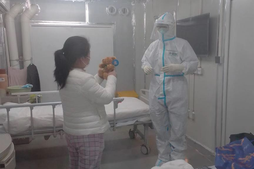 有位情绪暴躁的老爷爷,几次把护士的防护服扯破,甚至砸坏了病房的门锁、洗手池、防护窗,数次想要逃走。可是队员们依旧冒着暴露危险,温柔耐心地与他沟通,几位会武汉方言的女队员在繁忙的工作中仍尽力挤出时间来去陪他拉拉家常,抚慰他焦虑的心情,终于得到患者的理解及配合。