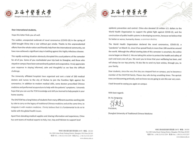 校长徐建光致信万象城官网国际学生