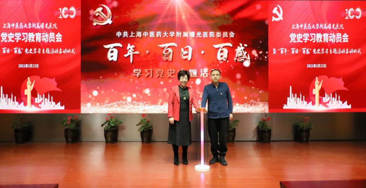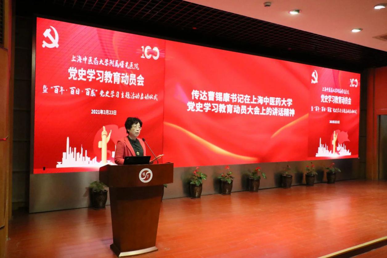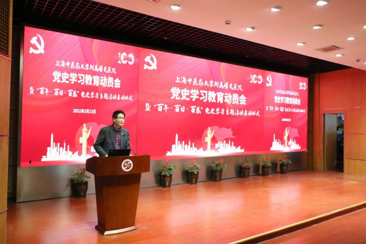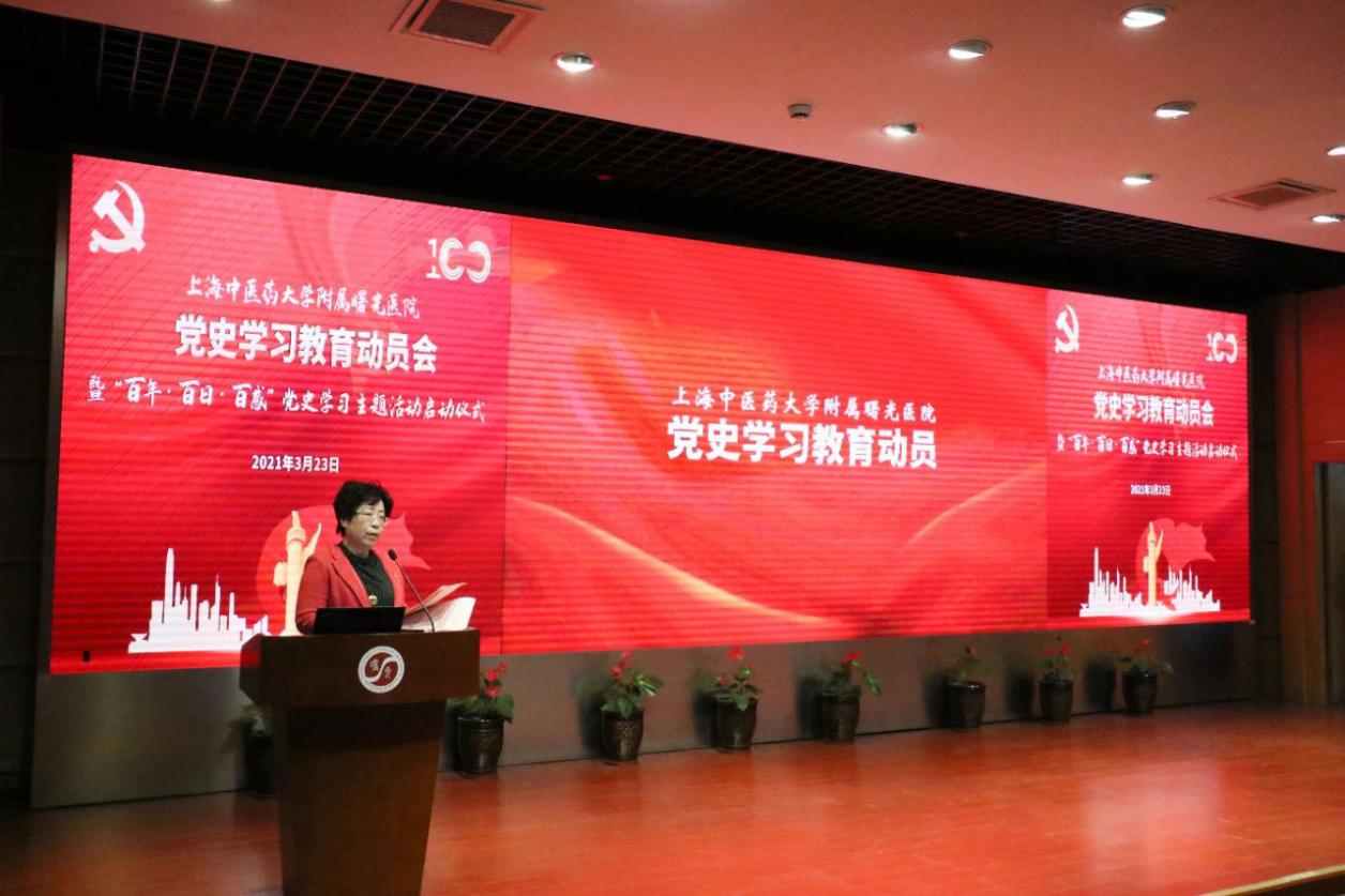 为深入学习贯彻习近平总书记在党史学习教育动员大会上的重要讲话精神和党中央《关于在全党开展党史学习教育的通知》精神,落实市委、教育部、市教委工作党委、awc77万象城官网党委的有关要求和部署,3月23日下午,附属曙光医院召开党史学习教育动员会暨“百年·百日·百感”党史学习主题活动启动仪式。曙光医院党政领导班子、党委委员、党支部书记及委员、行政职能科室负责人、临床科室主任、研究室主任等参会。医院党建共建单位上海市委党校谷宇教授、中共一大会址纪念馆李家佳应邀出席。会议由医院党委副书记、院长周华主持。