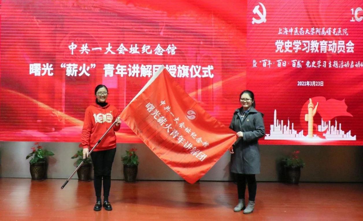 李家佳为曙光医院“薪火”青年讲解团授旗,标志着“薪火”青年讲解团加入一大会址纪念馆志愿者团队。