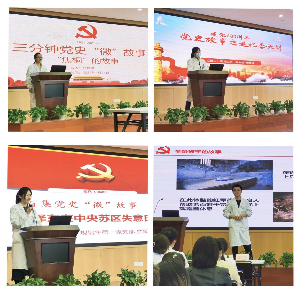 四名同志随后依次进行了“微”党史故事分享。入党申请者孟唤男向大家讲述了焦裕禄同志在兰考县工作期间带头植树造林、广栽桐树的故事。入党积极分子程怀锦带大家回顾了李大钊为革命献身的光荣事迹,号召大家不忘初心。规培生第一党支部组织委员贾蒙分享了伟大领袖毛泽东在失意期间始终坚守初心,扎扎实实下功夫,他对革命的坚定信念、宽阔的胸襟是青年党员学习的榜样。规培生第二党支部书记郑卫丛为大家重温了“半条被子”的故事,他热情洋溢的演讲带领大家重温了特殊年代的艰苦环境下共产党人始终坚守为人民服务的军民雨水情。