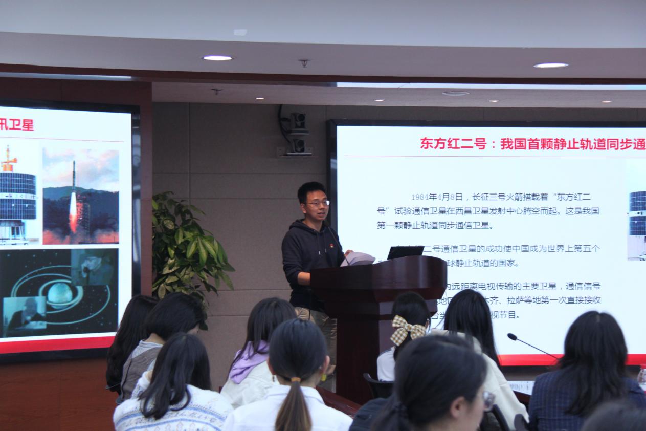 “埋头苦干,发愤图强,自力更生,奋勇前进。”通信卫星总体所青年科学家方鑫禹带领青年师生回首航天路,从我国自行研制的第一颗人造卫星—东方红一号的研发历程,讲述青年科学家“传承航天梦想、书写无悔青春”的故事。我国从过去几年才做一颗卫星,到现在一年可以发射15颗到20颗卫星,从卫星平台研制“跟跑”欧美国家到“领跑”世界,“小卫星”的奇迹就诞生在这里。青年科学家发扬“自主创新、开放融合、万众一心、追求卓越”的北斗精神和“无名英雄、无私奉献、无上光荣”的三无精神,以永不懈怠的精神状态和一往无前的奋斗姿态,为航天强国事业真情奉献,奋发有为,奏响“承国家之志,铸时代新星”的使命最强音。实现航天强国梦想,既需要抽穗拔节,又需要播散种子。中科院微小卫星创新研究院发射场团队自发捐款援建大凉山区小学图书馆和教师办公室,让航天的种子在大凉山区孩子们心中生根发芽。2019级博士研究生党员吕仪说:“我们应当深刻地、全面地学习他们的精神,服务人民、吃苦耐劳、坚持不懈、迎难而上、努力攻坚。”