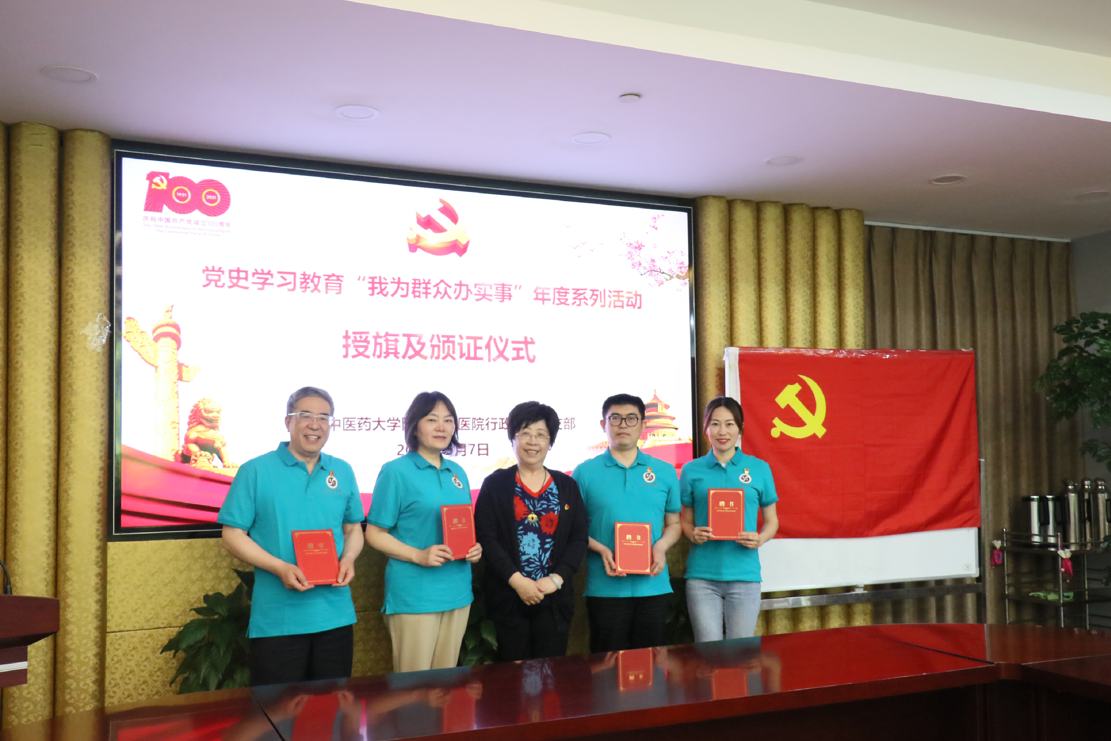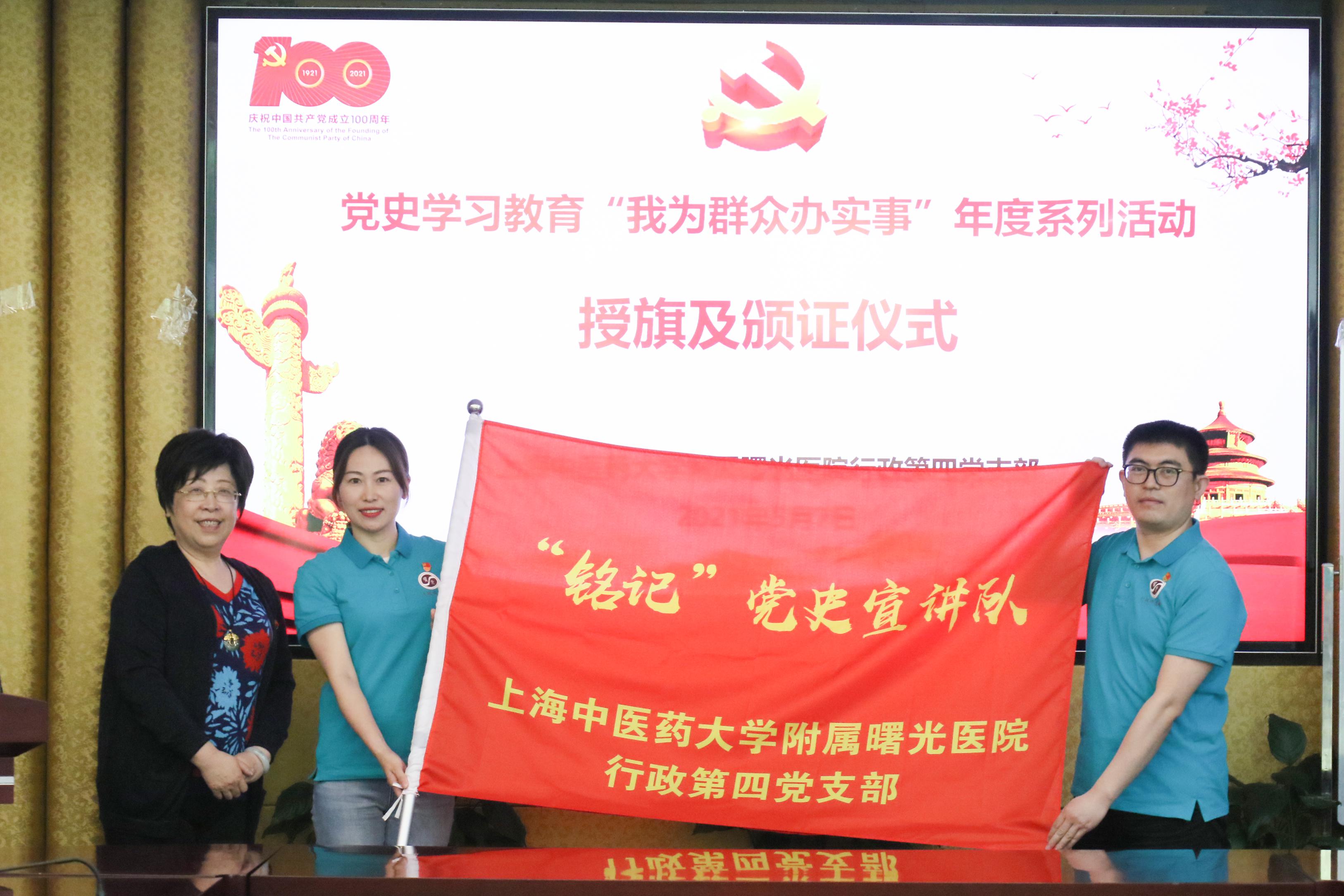 为深入贯彻落实awc77万象城官网党委和附属曙光医院党委关于党史学习教育的工作部署,5月7日中午,医院行政第四党支部召开党史学习教育之“我为群众办实事”系列活动授旗及颁证仪式。医院党委书记马俊坚出席。