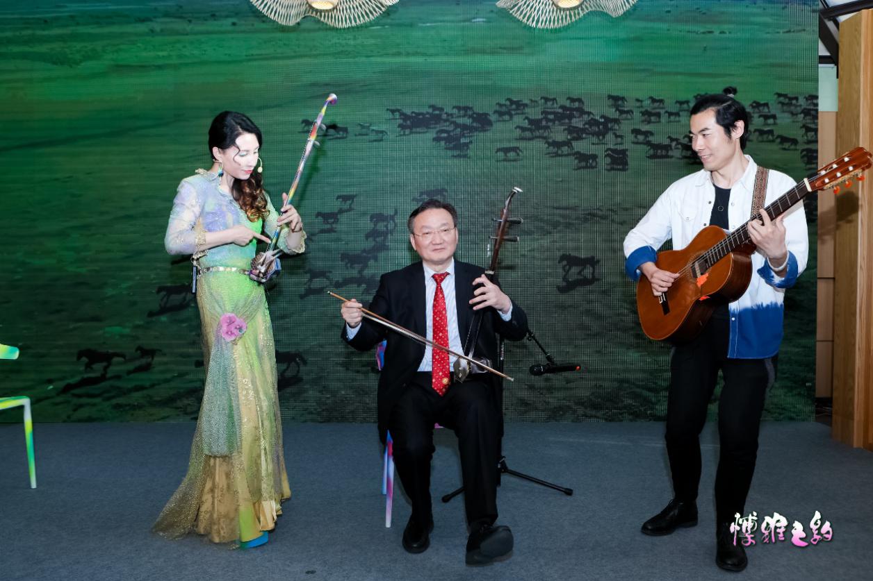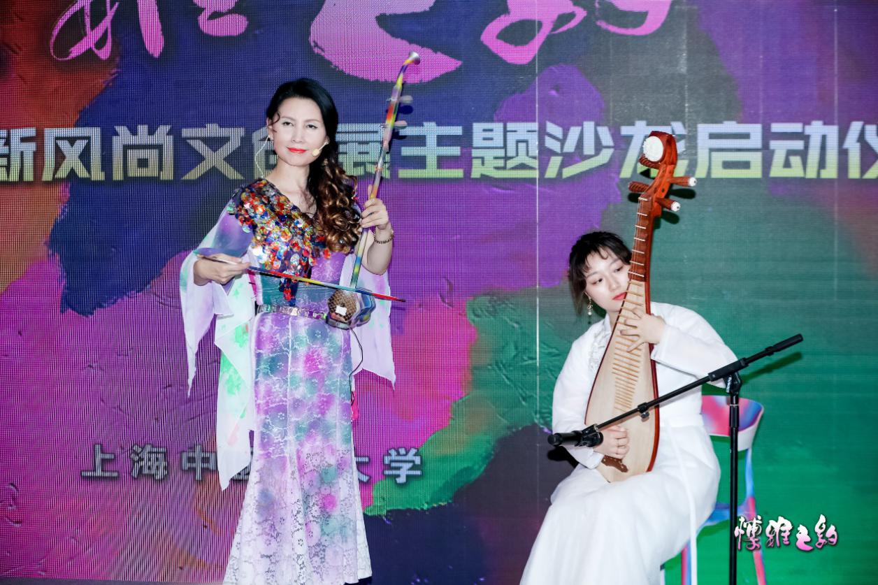 活动现场,艺术家携手为师生带来海派沙龙雅集《两弦间的宇宙》。二胡独奏《春江花月夜》、吉他二胡合奏《一步之遥》、诗乐演奏《忆江南》、经典曲目赏析等节目以独树一帜的惊艳演绎、浓烈的海派情愫及沉浸式的艺术体验,引领学生感受中国文化创新的艺术、穿越海派的风情与中国千年文化的回想。马晓晖、徐建光与音乐制作人陈功合奏乐曲《草原赛马》,更是透过美妙的旋律和多元文化的融合,呈现了音乐艺术的张力,赢得在场师生的阵阵掌声。