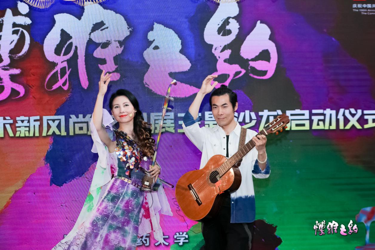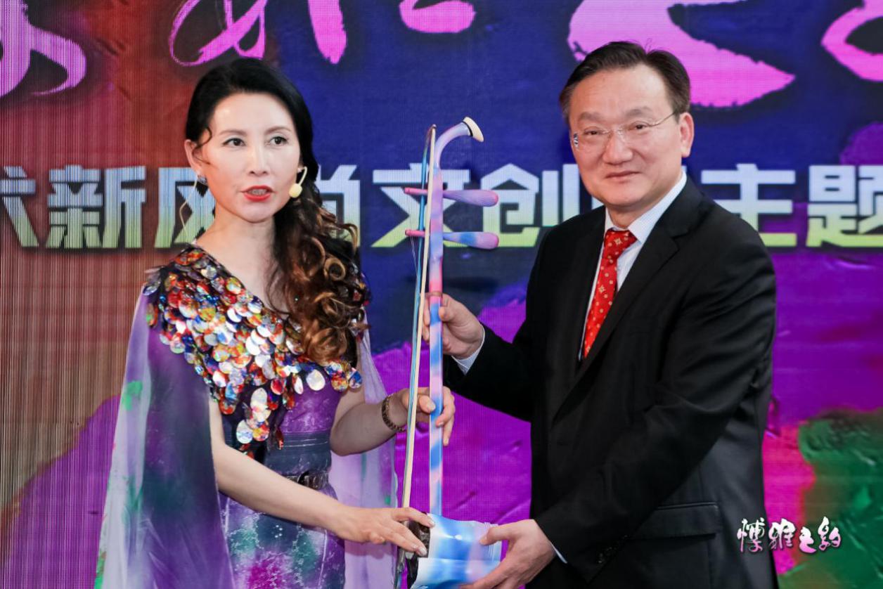 学校客座教授、著名二胡演奏家马晓辉随后向学校赠送原创彩绘二胡。手绘艺术家陈卫家和副校长陈红专共同为启动仪式揭牌。陈卫家以传统中国文化书法为体,以西方现代艺术彩绘为用,向学校赠送他创作的艺术书法作品。