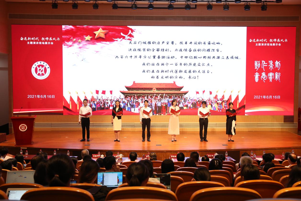 来自各条线的青年教师们结合党史学习教育体会共提交20个演讲作品,大会遴选了9个优秀作品,围绕“薪火相传心向党”“青春筑梦新时代”“启智润心担使命”“铸魂育人守初心”四个篇章,向台下300多名师生代表进行现场展示。青年教师们以演讲的形式传递铿锵力量,表达赓续红色基因铸魂育人的决心。