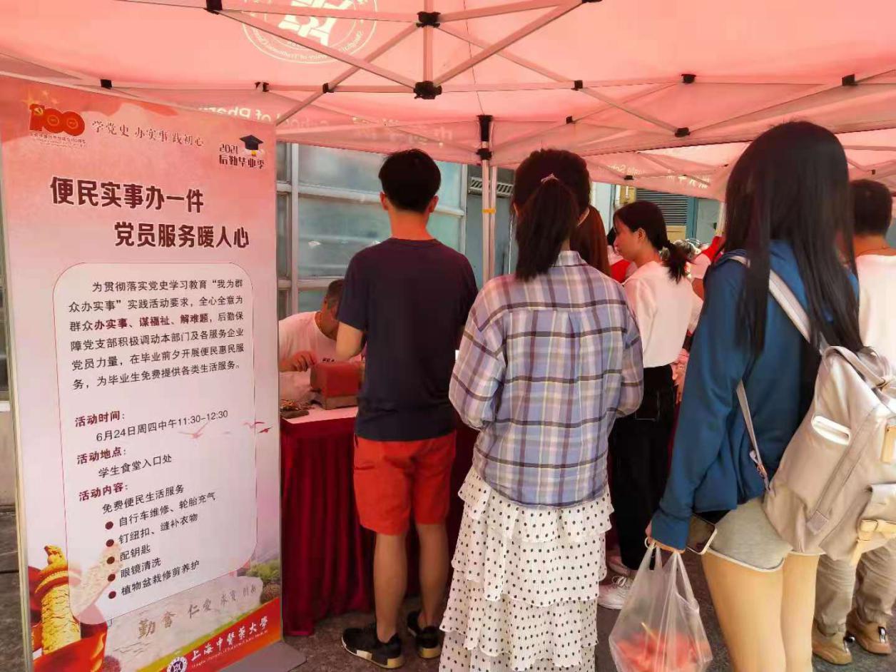 为进一步推进党史学习教育见实效,提高党员服务群众能力,6月24日中午,后勤保障党支部组织本部门及各服务企业党员力量,在学生生活园区食堂入口广场开展惠民服务主题党日。