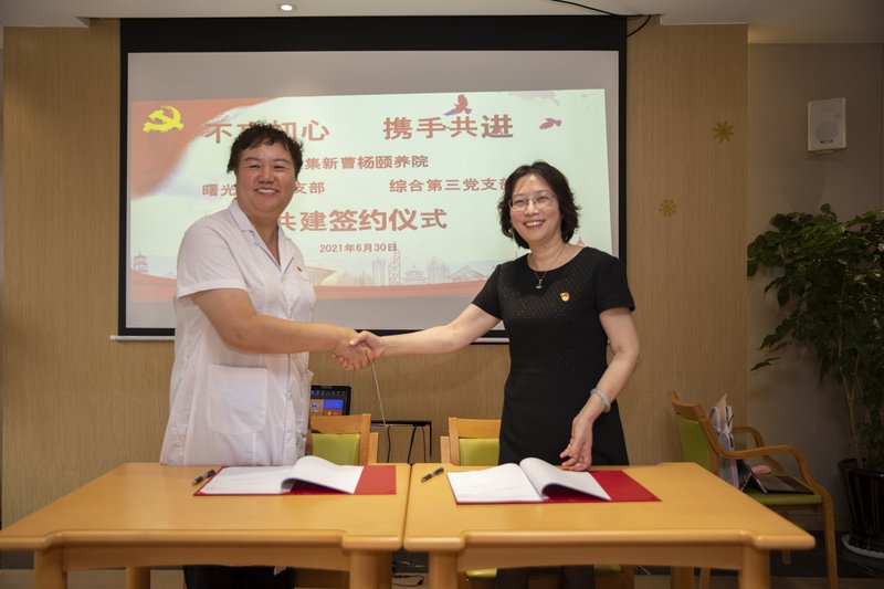 张珏介绍曙光医院的百年院史和“检爱”先锋队。在曙光人和颐养院所有老人的共同见证下,张珏与王玉英签署共建协议,并举行微心愿捐赠仪式。