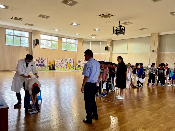 科普讲座结束后,东波小学的老师和志愿者们将小朋友们有序安排至学校体育馆,进行现场筛查,由医生王玉鹏和王媛媛依次开展评估、筛查和记录。