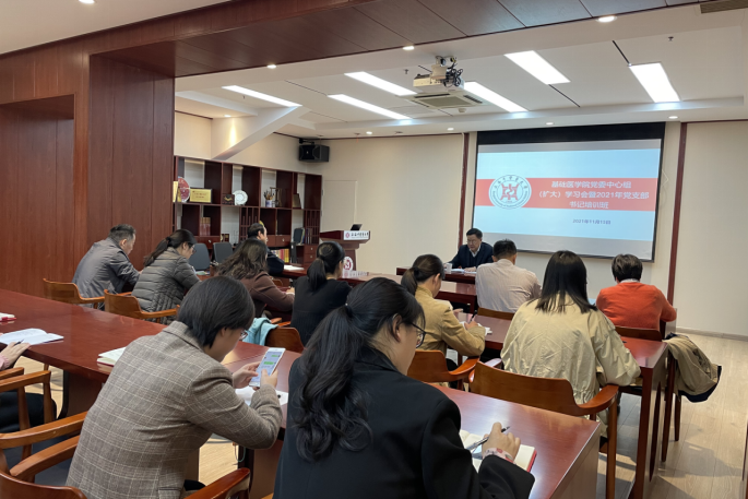 11月15日下午,基础医学院党委中心组(扩大)学习会暨2021年党支部书记培训班专题学习会在6505举行,专题学习第二十七次全国高校党的建设工作会议精神和上海高校党的建设工作会议精神。上海市教卫工作党委系统党建研究会顾问顾继虎应邀作专题辅导报告。学院党委书记夏文芳,学院党委委员,党支部书记、支部委员,党员师生代表等40余人参加学习。会议由学院党委副书记陆佩丽主持。