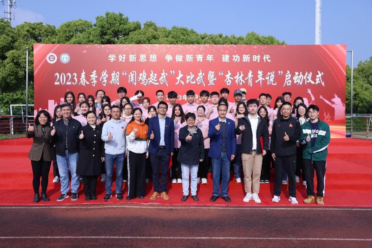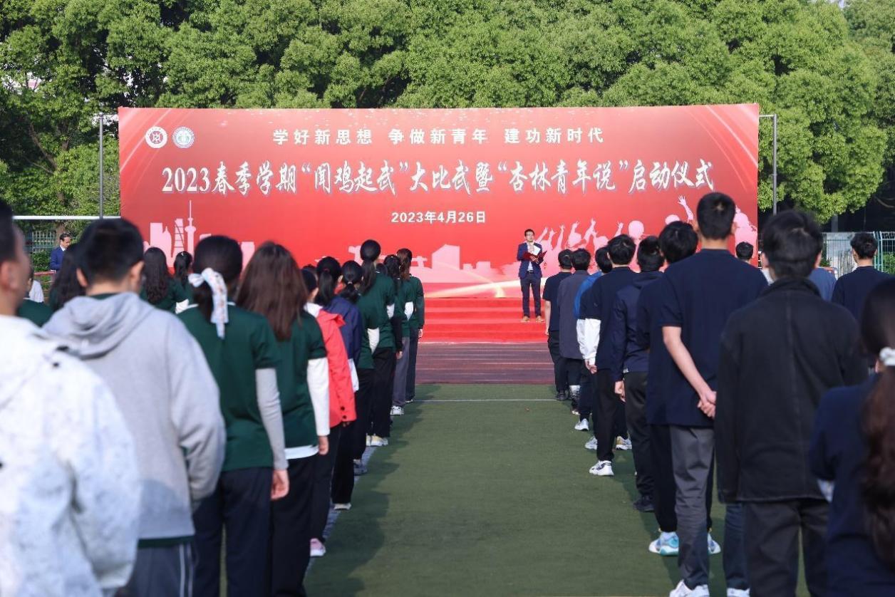 晨起闻鸡鸣,“武”动正青春。4月26日清晨,2023年春季学期“闻鸡起武”大比武暨“杏林青年说”启动仪式在学校体育场举行。基础医学院党委、体育部党支部、党建共建单位的党员代表、基础医学院2022级全体学生等近300名师生参加。活动由2021级中医学(屠呦呦班)常睿发和朱逸菲主持。