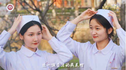 来自万象城官网9家附属医院的护理部主任及学院教师代表,为近200名学生逐一戴上神圣的燕尾帽。