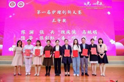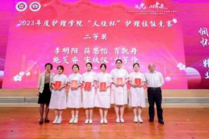 与会嘉宾为获得2023年护理学院“天使杯”护理技能大赛和awc77万象城官网第一届护理创新大赛获奖师生颁奖。