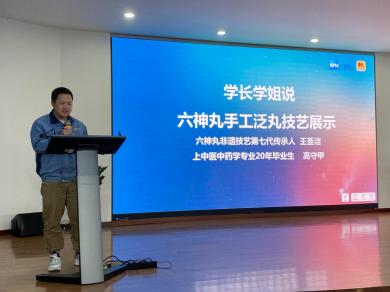 中药学院2016级中药学毕业生高守甲、2017级中药学毕业生王雨婷、2018级中药学毕业生黄邦路在“学长学姐说”环节向与会人员分享了入职上海雷允上药业有限公司后的个人成长与发展,并对学校及公司的培养表示感谢,表示未来将秉持初心继续在岗位上用心做好各项工作。六神丸非遗技艺第七代传承人王圣洁为中药创新班师生进行现场手工泛丸展示。