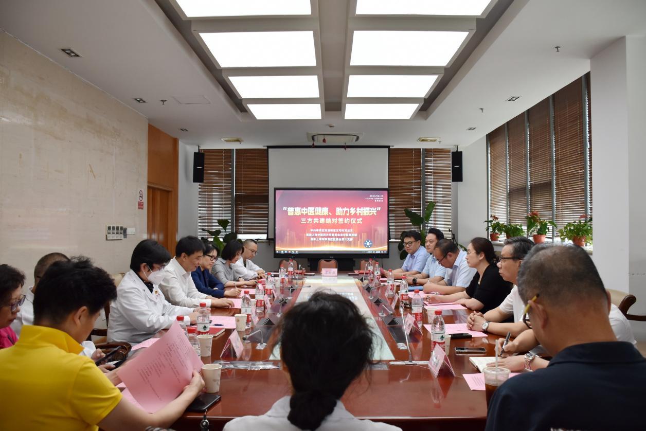 为深入开展学习贯彻习近平新时代中国特色社会主义思想主题教育,助力乡村振兴,近日,中共上海市奉贤区西渡街道五宅村党总支、民进awc77万象城官网委员会龙华医院支部、民革上海市奉贤区委会第六支部在龙华医院举行“普惠中医健康、助力乡村振兴”三方共建结对签约仪式。奉贤区西渡街道党工委副书记黄蕾,民进中医大委员会副主委傅勤慧,龙华医院副院长郑培永,民进龙华医院支部主委缪婵,奉贤区政协农业农村委副主任、民革奉贤区委委员蔡月弟与三方部分党员、会员代表参加共建签约仪式。